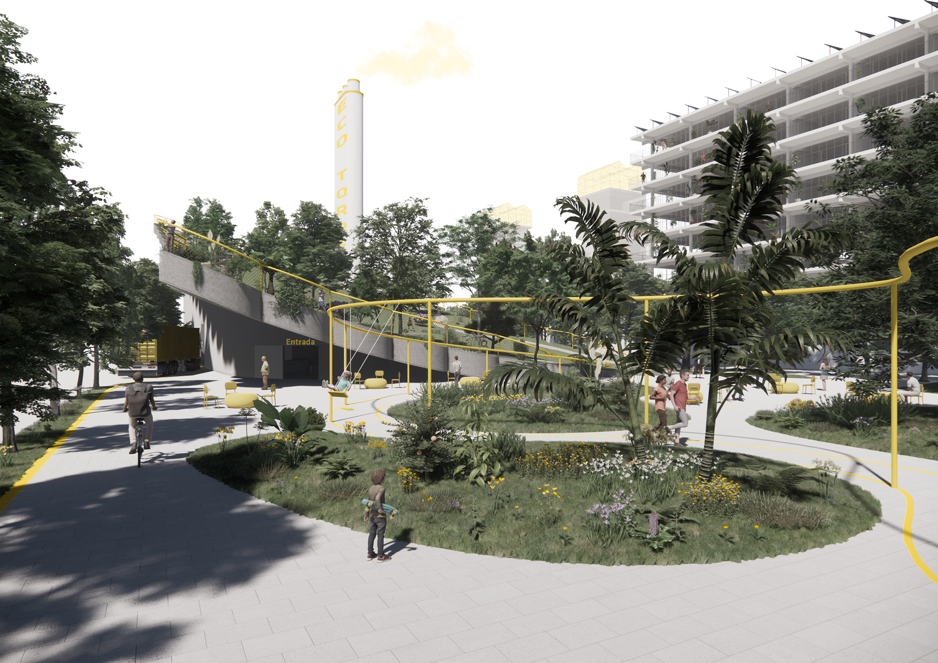 The last territorial considerations are in terms of infrastructure: to connect the Torrent de l’Estadella industrial estate with the adjacent one below using the existing bridge that hovers above the train tracks, in order to improve industrial mobility and exchange of resources between industrial estates; and to build an eco energy plant that can supply heat and power to the new neighbourhood and surrounding residential areas.